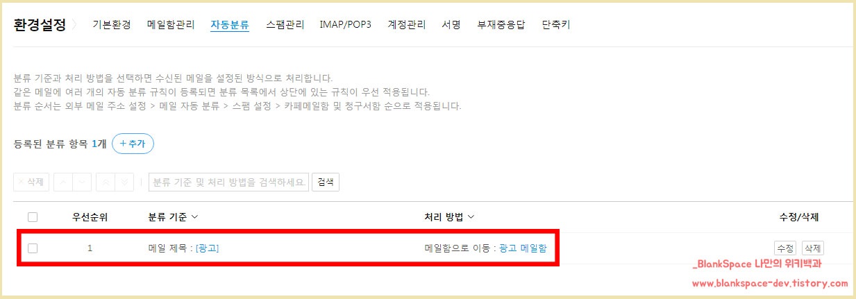 아래처럼 되셨나요? 그럼, 자동 분류를 하기 위한 설정은 끝난 거에요. 굉장히 간단하죠?