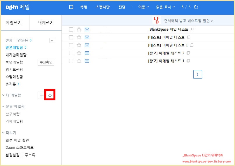 로그인을 하셨으면 아래 화면을 확인할 수 있을거에요. 여기서 내 메일함의 오른편을 보면 톱니바퀴가 있을거에요.