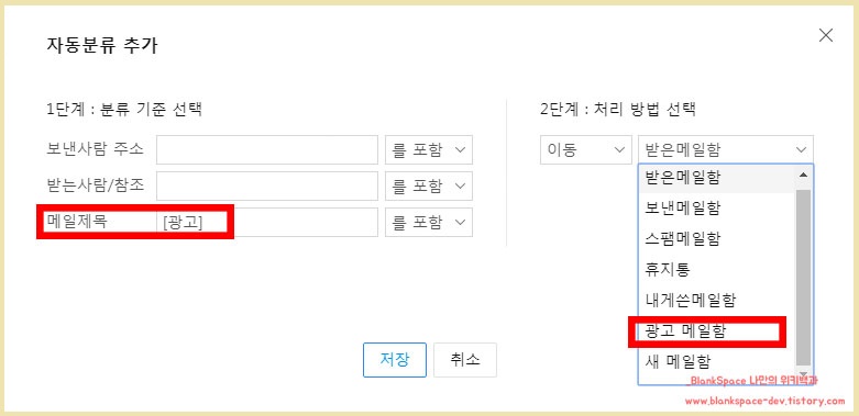 저는 메일제목이 [광고]일 경우에 아까 만든 광고 메일함으로 자동으로 이동하도록 설정할께요.
