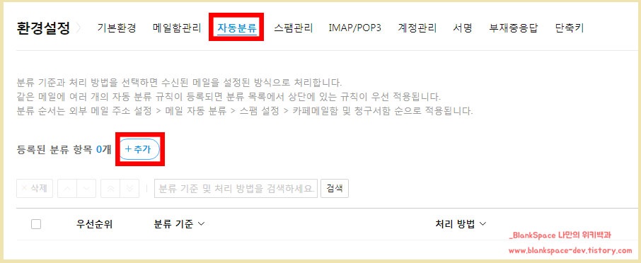 새로운 메일함을 만들었다면, 이제 자동으로 분류를 해야겠죠? 아래 이미지처럼 자동 분류 탭을 눌러주세요.