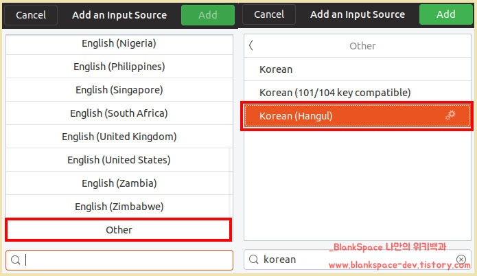 Other의 검색창에서 Korean을 입력하시면, 오른쪽 이미지처럼 Korean (Hangul) 이 있을 것입니다. 이것을 눌러주신 후, Add 버튼을 눌러주세요.