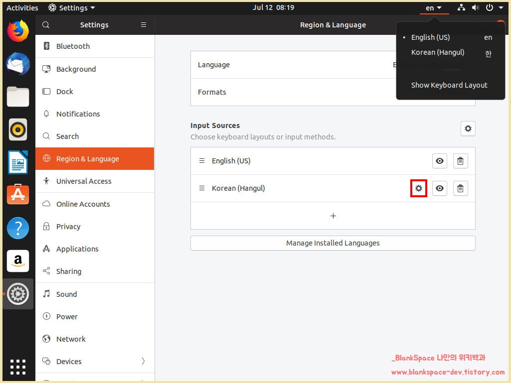 물론, 리눅스 자체에서 한글에 대한 지원이 그리 좋지는 않기 때문에, 아래서 설명하는 부분에서 한글 관련 설치를 하나 할 것이지만, 우분투 자체에서 한영 설정을 할 수 있도록 지원하고 있었습니다.