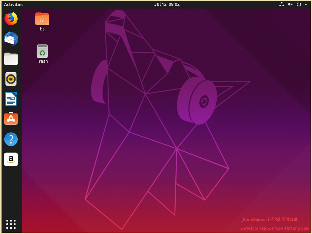 가장 먼저, 우분투의 바탕화면이 보이실 거에요. 아래와 같은 화면이겠죠.