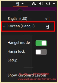 여기서, Korean (Hangul)를 선택하여 변경하시고, Hangul Mode를 켜주세요.