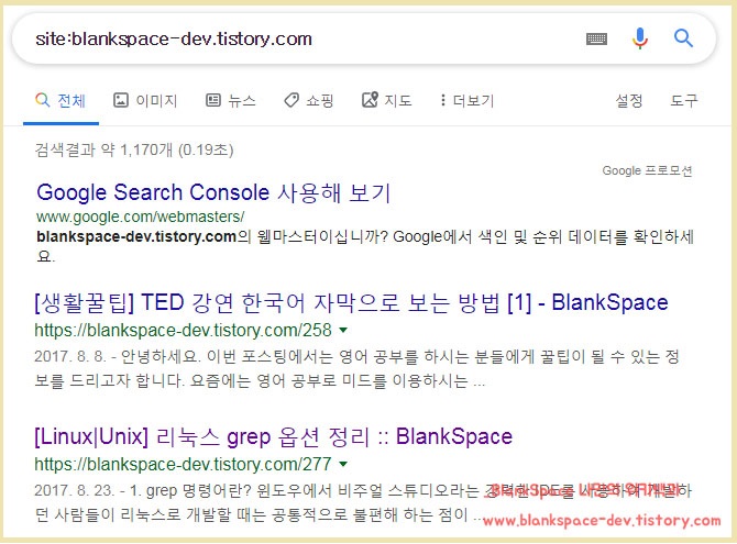 저는 제 사이트 주소를 이용하여 구글링을 해봤습니다. 아래 이미지를 참고해주세요.