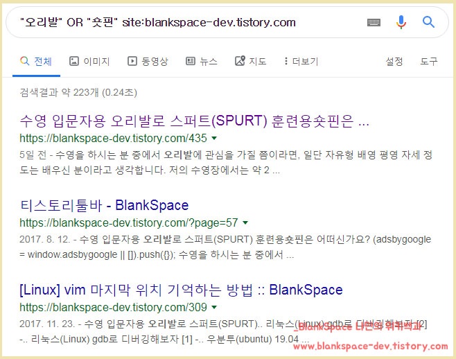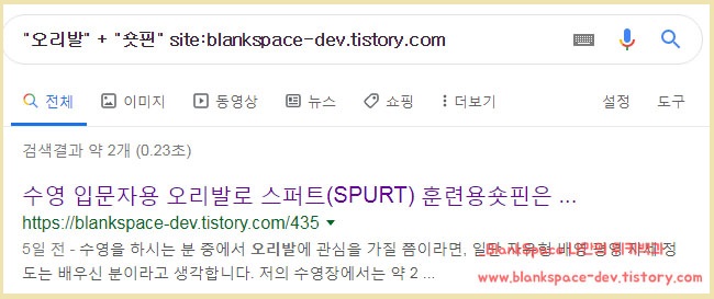 저는 예전에 썼던 포스팅으로 오리발과 숏핀이라는 키워드를 포함한 검색 결과를 찾아봤습니다. 뒤에 있는 site는 저의 사이트 내에서만 검색하도록 하기 위함이니 신경쓰지 않으셔도 됩니다.
