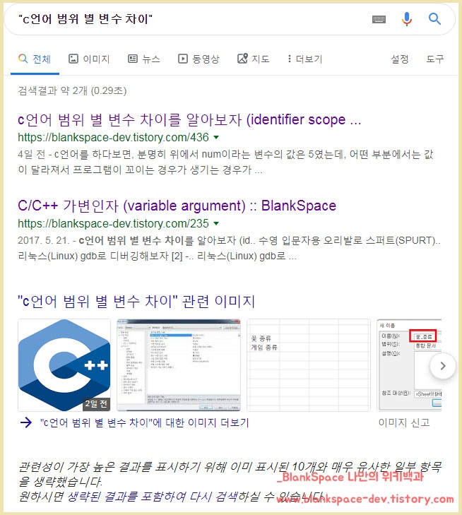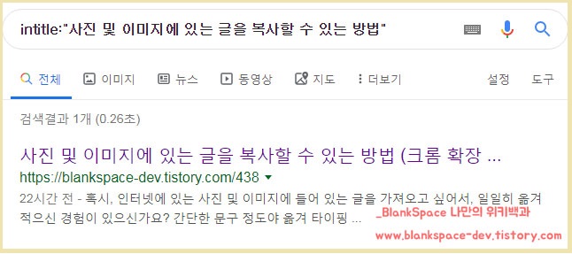 역시나, 저는 예전에 썼던 포스팅 내용을 쌍따옴표를 이용하여 검색해봤습니다. 그 결과, 아래처럼 해당 내용이 들어간 포스팅만 검색결과로 나오는 것을 확인할 수 있었습니다,