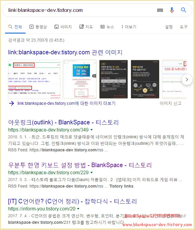 저는 예제로 제 사이트 주소를 이용하여, 명령어를 사용해봤습니다. 그 결과, 아래 이미지처럼 제 사이트를 링크한 사이트도 검색되는 것을 볼 수 있습니다.