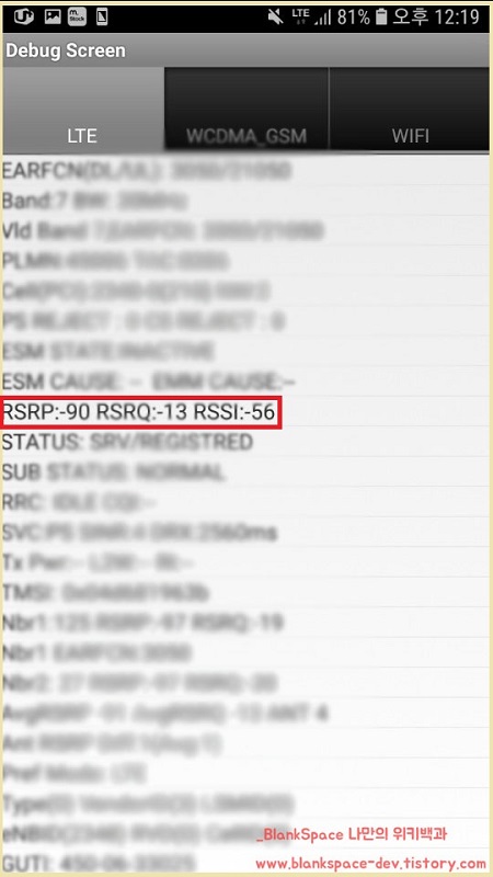 저는 RSRP : -90 / RSRQ : -13 / RSSI : -56 로 측정되었습니다.