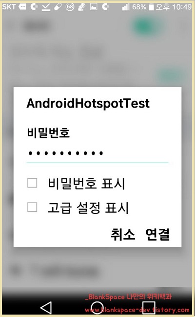 해당 핫스팟 이름을 찾으셨다면 눌러주세요. 이후, 위에서 설정한 비밀번호를 입력하시면 되겠습니다.