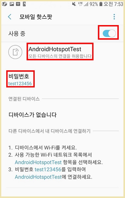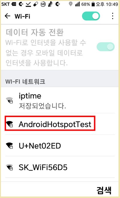 모바일 핫스팟이 제대로 작동하는 지 확인하기 위해서는 다른 스마트폰을 이용해야 합니다.
