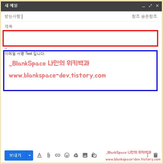 아래처럼, 빨간 네모 박스 부분은 이메일의 내용 부분을 적어주시면 되고, 파란 네모 박스 부분은 서명 부분으로, 자신이 설정한 서명 내용이 들어가는 것을 확인할 수 있을 거예요.