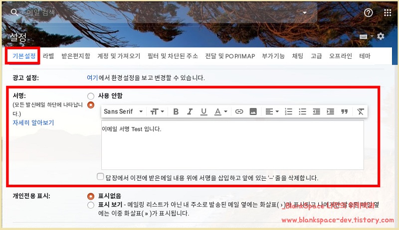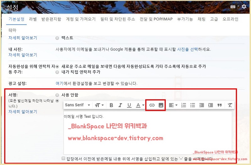 서명 부분은 텍스트(글)만 사용할 수도 있고, 이미지 또는 링크를 추가할 수도 있답니다.