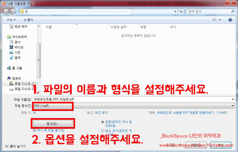 모두 끝나셨다면, 옵션 창의 확인 버튼과 다른 이름으로 저장 창에서 저장 버튼을 눌러주세요.