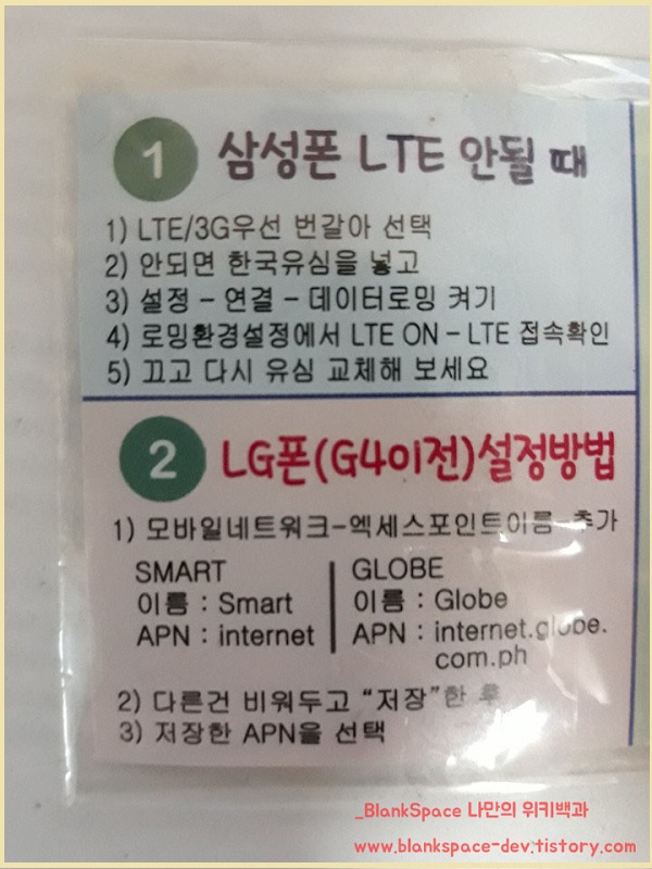 이럴 경우에는 유심칩을 받을 때, 아래처럼 방법이 적힌 종이가 있을 거예요. 이 글을 참고해보시고 따라 해 보시는 것도 좋을 것 같습니다.