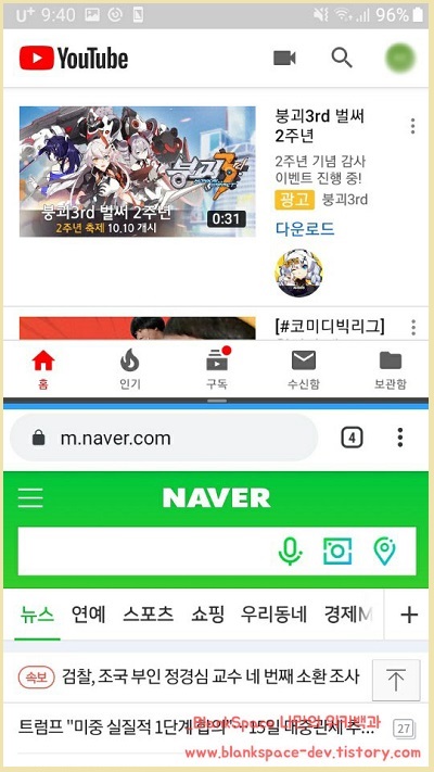 위에는 유튜브 화면이 보이고, 아래는 기존 화면이 보이시죠?
