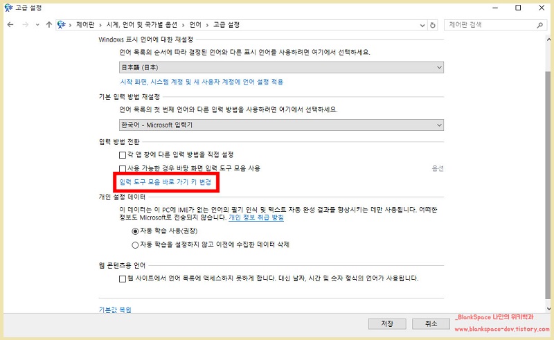 바로, 윈도우(Windows)10 에서 입력언어 변경 단축키를 변경하거나 비활성화 하는 방법입니다.