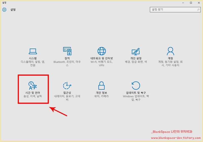 아래처럼, 여러 설정 내용이 나올텐데, 시간 및 언어 설정을 눌러주세요.