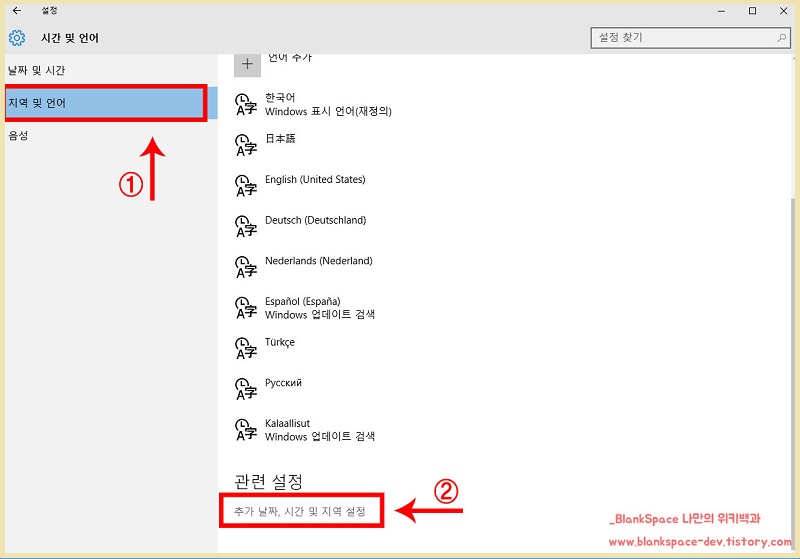 지역 및 언어 화면으로 전환될텐데, 마우스 스크롤을 내려보시면 아래에 추가 날짜, 시간 및 지역 설정 이라는 문구가 보이실 겁니다.