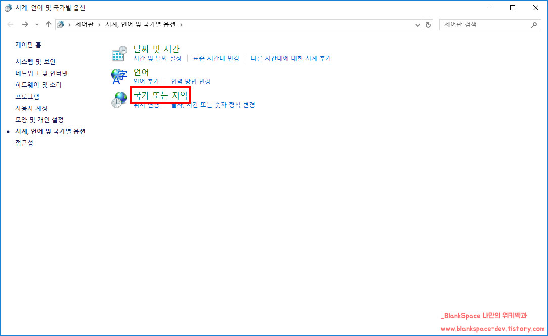 그럼, 아래처럼 시계, 언어 및 국가별 옵션 창이 뜹니다.