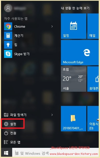 먼저, 시작 버튼 또는 윈도우 키를 눌러서 아래처럼 띄워주세요.