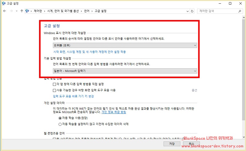 아래처럼, Windows 표시 언어에 대한 재설정, 기본 입력 방법 재설정 그룹이 보일 거예요. 이것을 모두 일본어로 변경해주세요.