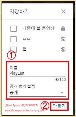 재생목록은 아래처럼 이름과 공개 범위 설정을 설정하면 되겠습니다.