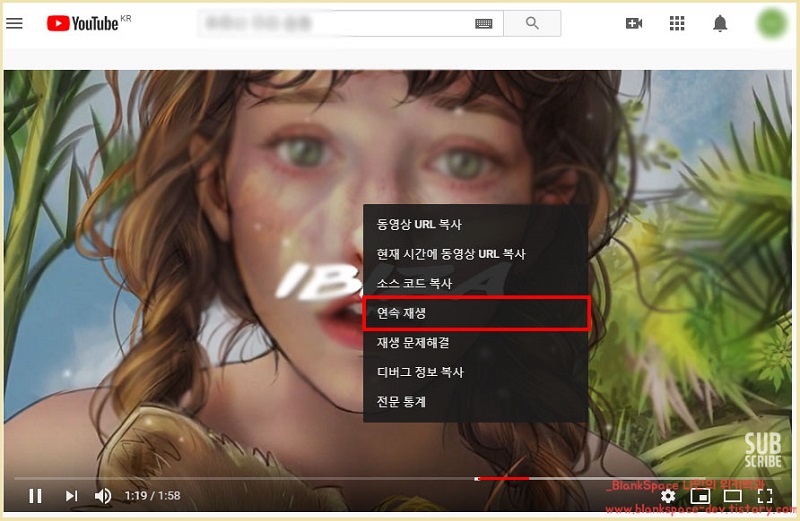그러면, 아래처럼 마우스 메뉴가 나옵니다. 여기서 연속 재생 탭을 눌러주시면 되겠습니다.