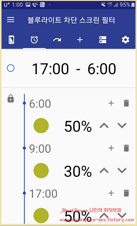 기본으로 제공하는 블루라이트 필터에는 필터의 강도, 예약 시간으로 필터를 켜는 기능 정도가 있네요.