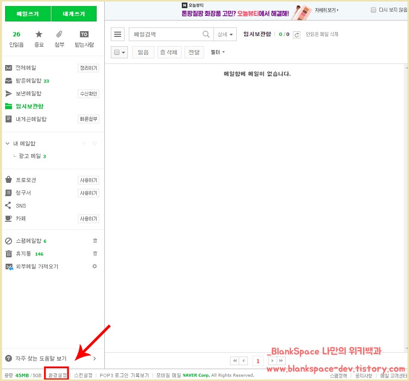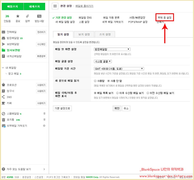 환경설정을 누르시면, 메일에 대한 설정을 할 수 있는 내용이 나옵니다.
