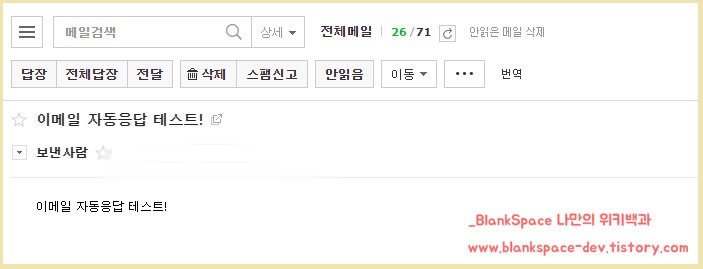 이제, 부재 중 자동응답 설정을 마쳤으니, 실제로 자동으로 메일이 응답되는지 확인해봐야겠죠?