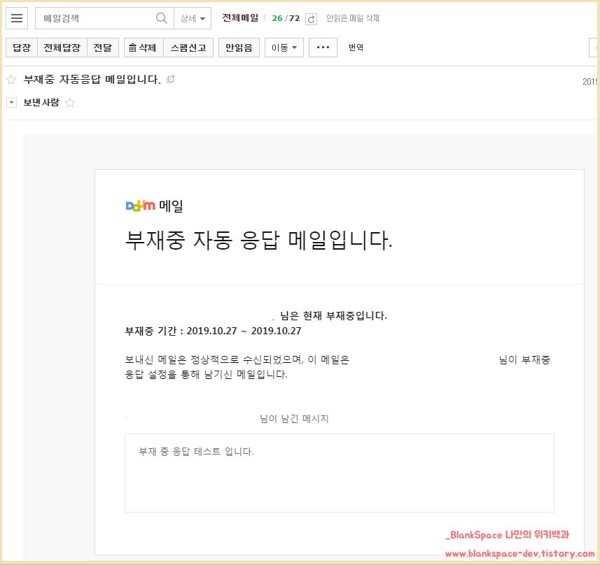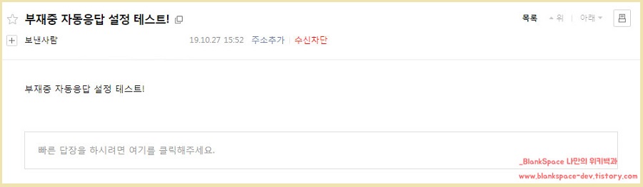 아래처럼, 다음 메일에서 부재중 자동 응답 메일을 보낸 것을 확인할 수 있습니다.