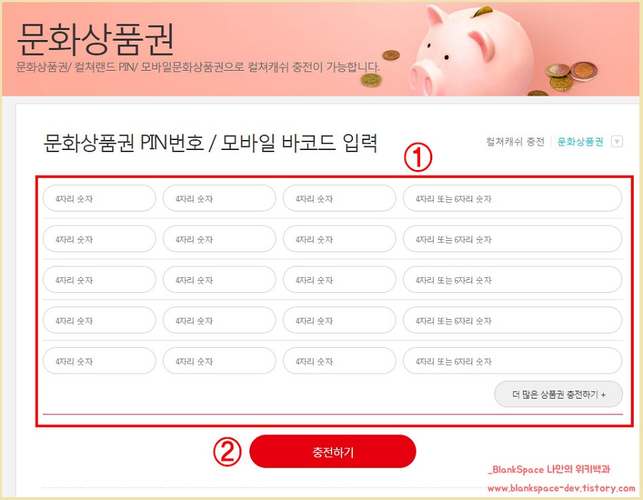 입력해야될 것이 왜이리 많은 것이냐라고 생각하실 수도 있습니다만, 문화상품권이 한장이라면 첫 줄에만 PIN번호를 입력하면 되겠습니다.