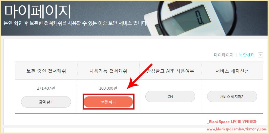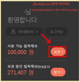 여기서 한가지 팁을 드리자면, 좀 더 안전한 컬쳐캐쉬 사용을 휘애서 안심금고에 돈을 넣는 것이 좋습니다.