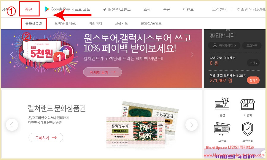 그래서 이번 포스팅에서는 컬쳐랜드에서 제공하는 문화상품권을 컴퓨터에서 충전하는 방법을 정리해보려고 합니다. 물론, 하는 방법은 간단하지만, 헤매는 사람도 있을 것으로 생각하여 적어봅니다.