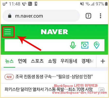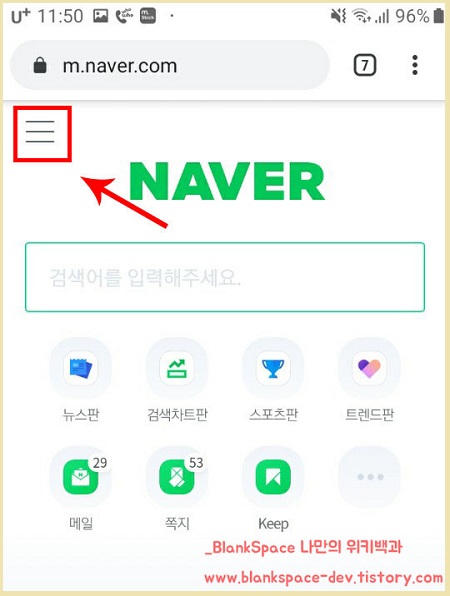 1. 먼저, 스마트폰에서 네이버 메인화면에 접속해주세요. 아래처럼 세줄로 된 부분이 보이실 텐데요.