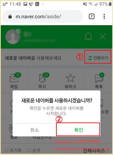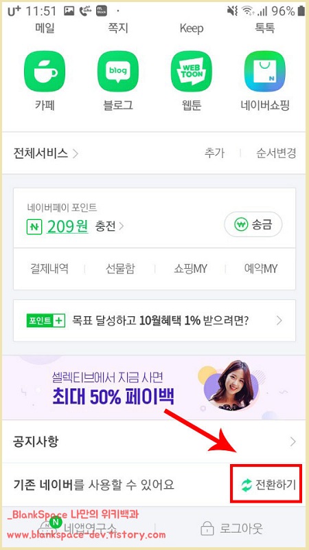 우리는 새로운 네이버 UI를 사용할 것이므로 다른 메뉴는 그대로 두시고, 아래에 보이시는 것처럼 전환하기 버튼을 눌러주세요.