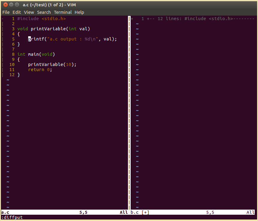 약간 말이 헷갈릴 수도 있는데, :diffput 명령어를 이용하면 왼쪽에 있는 파일에 다른 내용이 오른쪽 파일에도 적용된다는 뜻이다. 헷갈리다면 직접 해보는 것도 방법이다.