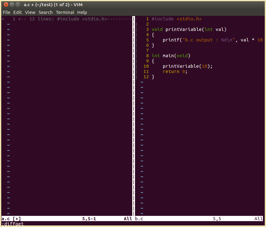 :diffput과 유사한데, :diffget은 오른쪽에 있는 다른 부분의 내용을 왼쪽에 파일로 적용하는 것이다. 때문에, 아래 이미지에서는 왼쪽 파일이 b.c와 같다고 표시가 된다.