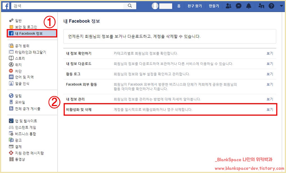 3. 설정 탭으로 화면이 전환되었다면, 오른쪽을 주목해주세요. 내 Facebook 정보라는 탭이 보이시나요? 이 탭을 누르시면 아래처럼 화면이 바뀔텐데, 여기서 아래에 비활성화 및 삭제 부분을 눌러주세요.