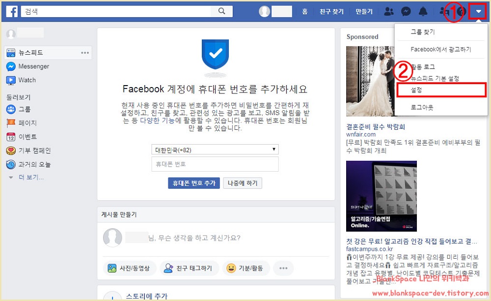 1. 먼저 페이스북 메인화면에 접속해주세요. 메인화면이라고 하면, 페이스북을 로그인한 후의 첫 화면을 말합니다.