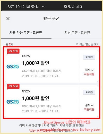 아래 보시면, 받은 쿠폰함에 사용 가능 쿠폰/교환권에 등록되어 있는 것을 확인할 수 있습니다.