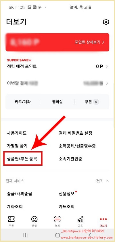 중간 부분을 보시면 상품권/쿠폰 등록이 보이실텐데요. 이 부분을 눌러주세요.
