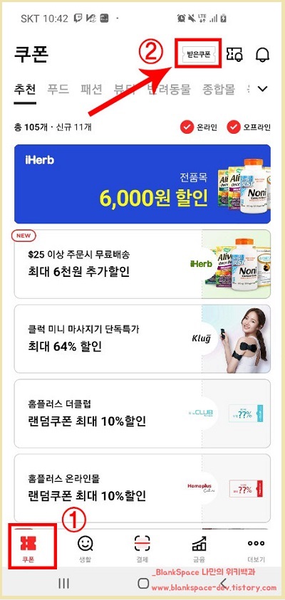 아래와 같은 화면으로 이동하셨나요? 이제, 상단에 받은쿠폰 부분을 눌러주세요.