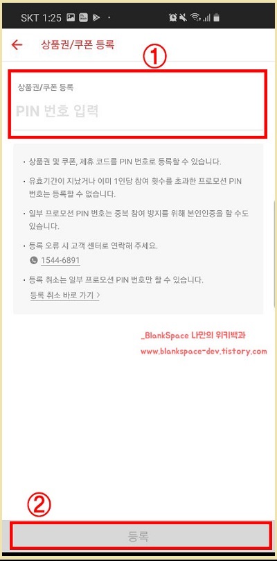 상품권/쿠폰 등록 화면으로 이동합니다. 이제, 이커머스에서 샀던 쿠폰의 PIN 번호를 아래 입력창에 넣어주세요.