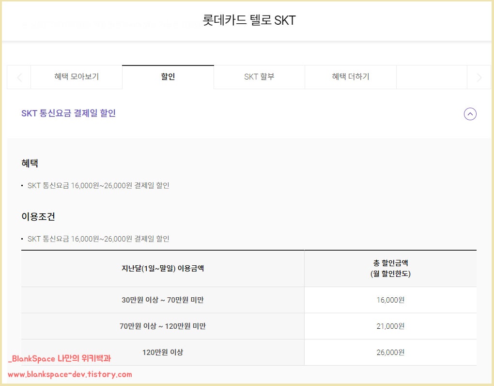 바로, 롯데카드 텔로 SKT라는 카드입니다. 이 카드의 좋은 점은 적은 실적으로도 꽤 많은 할인금액을 받을 수 있다는 점이었습니다. 그래서 많은 분들이 사용하고 계시더라고요.