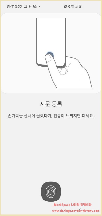 이전 갤럭시 시리즈에는 지문 인증 방법이 있는지 잘 모르겠는데, S10에서도 지문 인증 방법이 들어가 있습니다. 그래서, 처음 스마트폰을 설정할 때 지문을 등록해야 하더라고요. 기존 패턴 방식의 잠금 방식이었다면, 이제는 지문 또는 얼굴 인식으로 쉽게 잠금을 해제할 수 있는 것 같습니다.