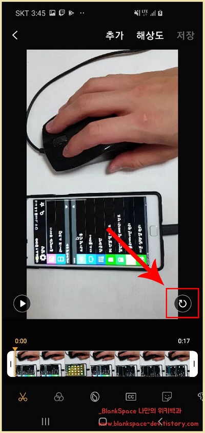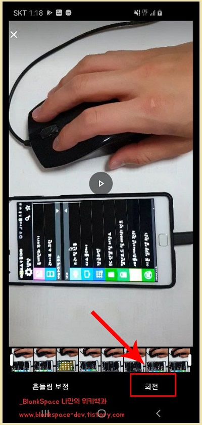 아래 보면, 회전이라는 글이 보이시죠? 이 글을 보면 동영상의 화면을 회전시킬 수 있습니다.