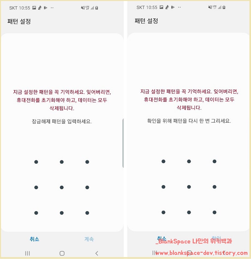 잠금해제 패턴 입력 후, 확인을 위한 패턴 입력까지 진행해주세요.