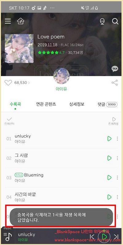 아래처럼 노래를 담으려고 하니, 중복곡을 삭제하고 1곡을 재생 목록에 담았습니다.라는 문구가 출력되는 것을 볼 수 있네요.